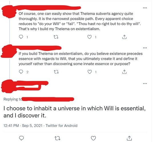 “Claro, é possível demonstrar facilmente que Thelema subverte completamente a agência. É o caminho mais estreito. Cada escolha aparente se reduz a “fazer a sua Vontade” ou “fracasso”. “Tu não tens direito, senão fazer a tua vontade”. É por isso que eu construo minha Thelema sobre o existencialismo.”