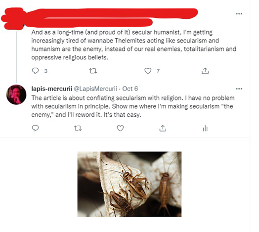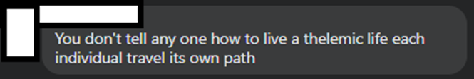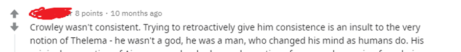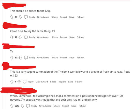 Eu lhe disse anteriormente que iria lhe mostrar as respostas àquele comentário do Reddit que calou a pessoa que fez uma pergunta sobre Thelema. Também lhe perguntei quantas pessoas você achava que discordariam disso.
