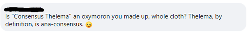 É aqui que se entra em conflito com Thelema de Consenso: não por apresentar uma interpretação X de Thelema, mas por apontar que a adoção de X significa que a interpretação Y deve estar errada em alguma característica. Esse é o tipo de dissonância cognitiva contra a qual um clichê que encerra a reflexão foi projetado para se proteger.