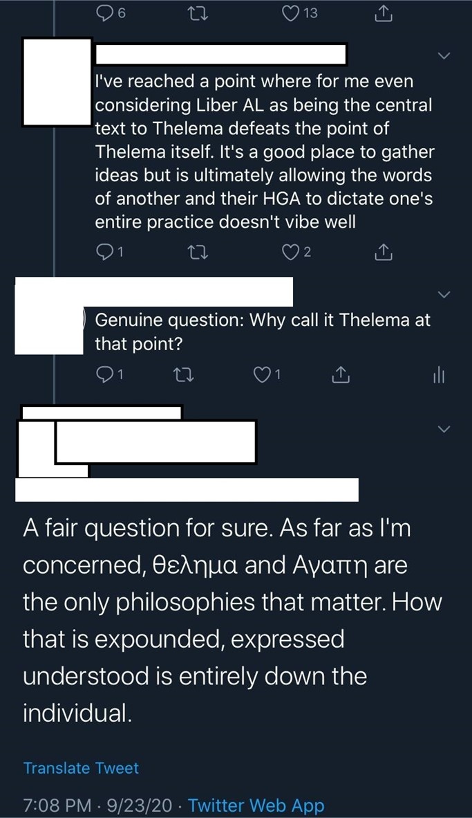 Não tenho a ilusão de que este artigo me trará muito mais do que respostas condescendentes ou odiosas. Ele provavelmente será tão útil para mim pessoalmente quanto dar murro em ponta de faca.[10] Mas talvez algumas pessoas leiam este artigo e se tornem mais conscientes da maneira como elas ou outras pessoas estão eliminando a complexidade e excluindo pontos de vista alternativos e maneiras de praticar Thelema. Se você acha que já é um pensador muito aberto e criativo, ou que a subcultura thelêmica expressa isso, então prestar atenção a esses padrões de fala e pensamento só pode torná-lo melhor.