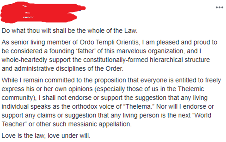 O resultado é que ninguém precisa ser responsabilizado por seus pontos de vista. Você pode dizer qualquer besteira que quiser – basta dizer “Eu não falo em nome da O.T.O. ou de outros thelemitas, blá blá blá” – e, se for contestado, pode simplesmente acenar com a mão e dizer: “Cada um na sua! 🙂 ”
