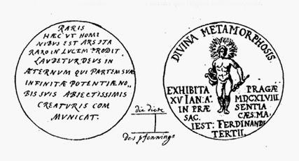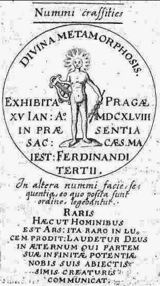 De um lado da moeda, figura a representação de um jovem nu, cuja cabeça é um sol radiante. Na mão direita, segura a lira de Apolo; na esquerda, o caduceu de Mercúrio. A inscrição em latim diz: “Divina Metamorfosis, realizada em Praga, 15 de janeiro de 1648, na presença de Sua Santíssima Majestade, o Imperador Fernando III”. No verso, também em latim, lê-se: “Assim como poucas pessoas conhecem esta arte, é raro que venha à luz. Bendito seja Deus por toda a eternidade, que de tempos em tempos revela a suas miseráveis criaturas parte de sua imensa sabedoria”.(2)